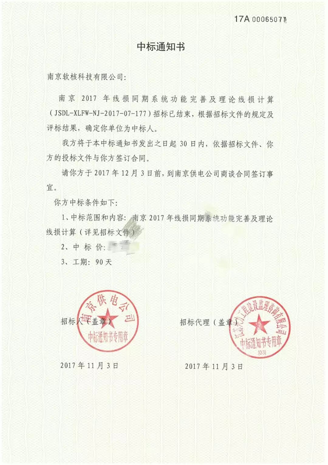 热烈祝贺南京软核科技有限公司《南京2017线损同期系统功能完善及理论线损计算》项目中标!!!